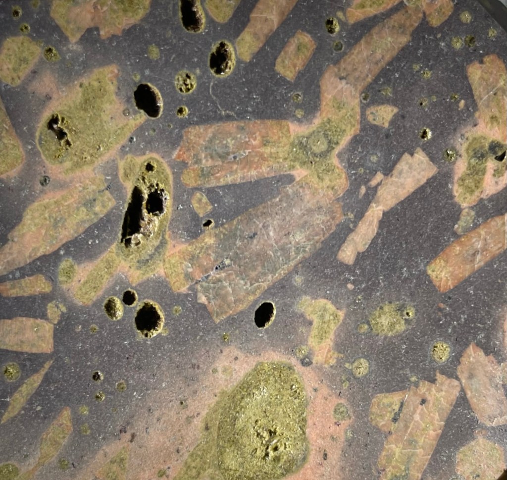 - En annen bergart som opptrer i områdene er ryolitt. Ryolitten er en grålig til rødlig, finkornet lavabergart med samme kjemiske sammensetning som granitt. Den har størknet raskere enn granitten, og er derved mer finkornet. En spesiell variant av ryolitten er sfærulittfels der en bråavkjølt smeltemasse av granittmagma ble presset inn i sprekker i fjellet nedenfra og dannet en ustabil obsidian. Etter noen millioner år begynte massen å krystallisere ut feltspat og kvarts i kuler med lag på lag i en slags løkstruktur. Og med påvirkning av hematitt er sfærulittfelsen gjerne rødlig i fargen.