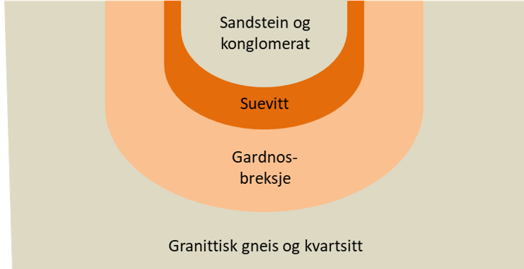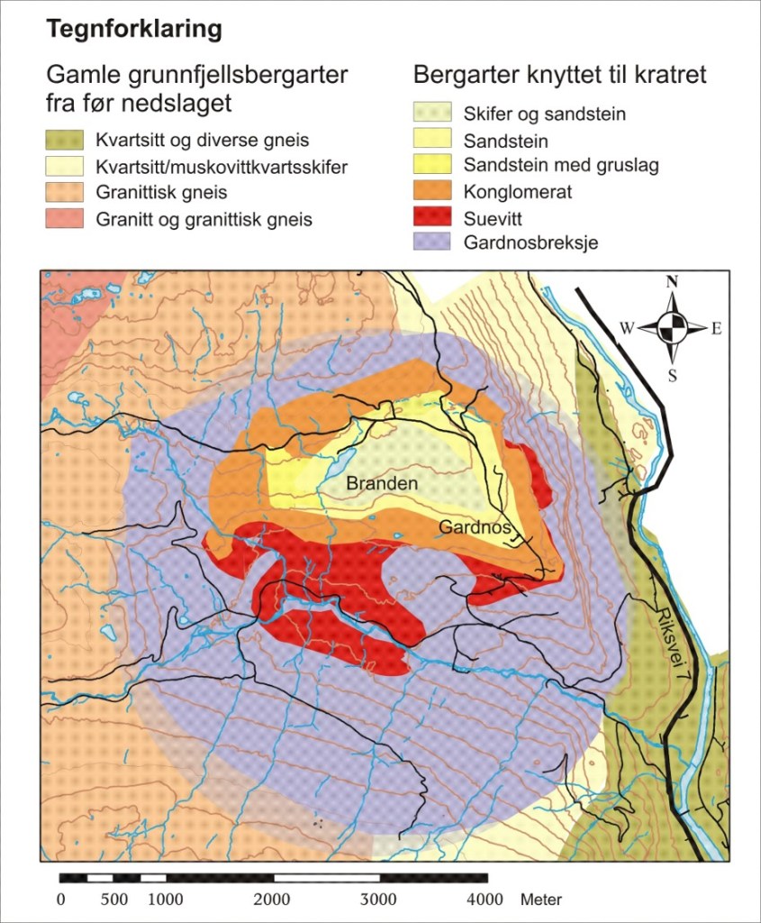 Trykkbølgene fra nedslaget spredte seg nedover i bakken og knuste opp berggrunnen. Denne berggrunnen bestod hovedsakelig av gneis med noen amfibolitt-ganger, og en del kvartsitt mot østsiden av krateret. I et tilnærmet sirkelformet område finner vi i dag en bergart bestående av hvite fragmenter av granittisk gneis eller kvartsitt i en svart karbonholdig masse. Gjennom mange millioner år har den blitt presset sammen til en svært hard bergart. Dette er Gardnos-breksjen.